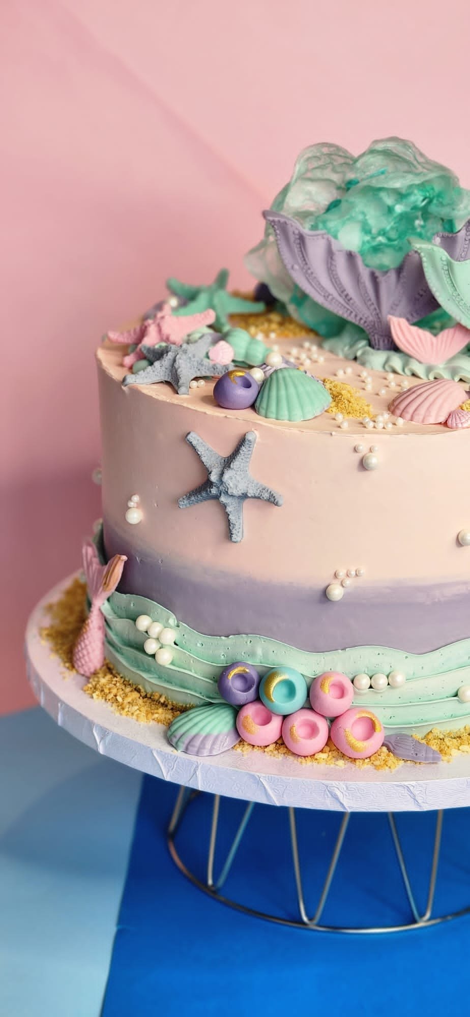 Dive into a world of sweetness with our Candy-colored Mermaid Delight Cake. Featuring pastel hues reminiscent of sugary treats and adorned with enchanting mermaid-inspired decorations, this whimsical creation is sure to make a splash at any celebration.