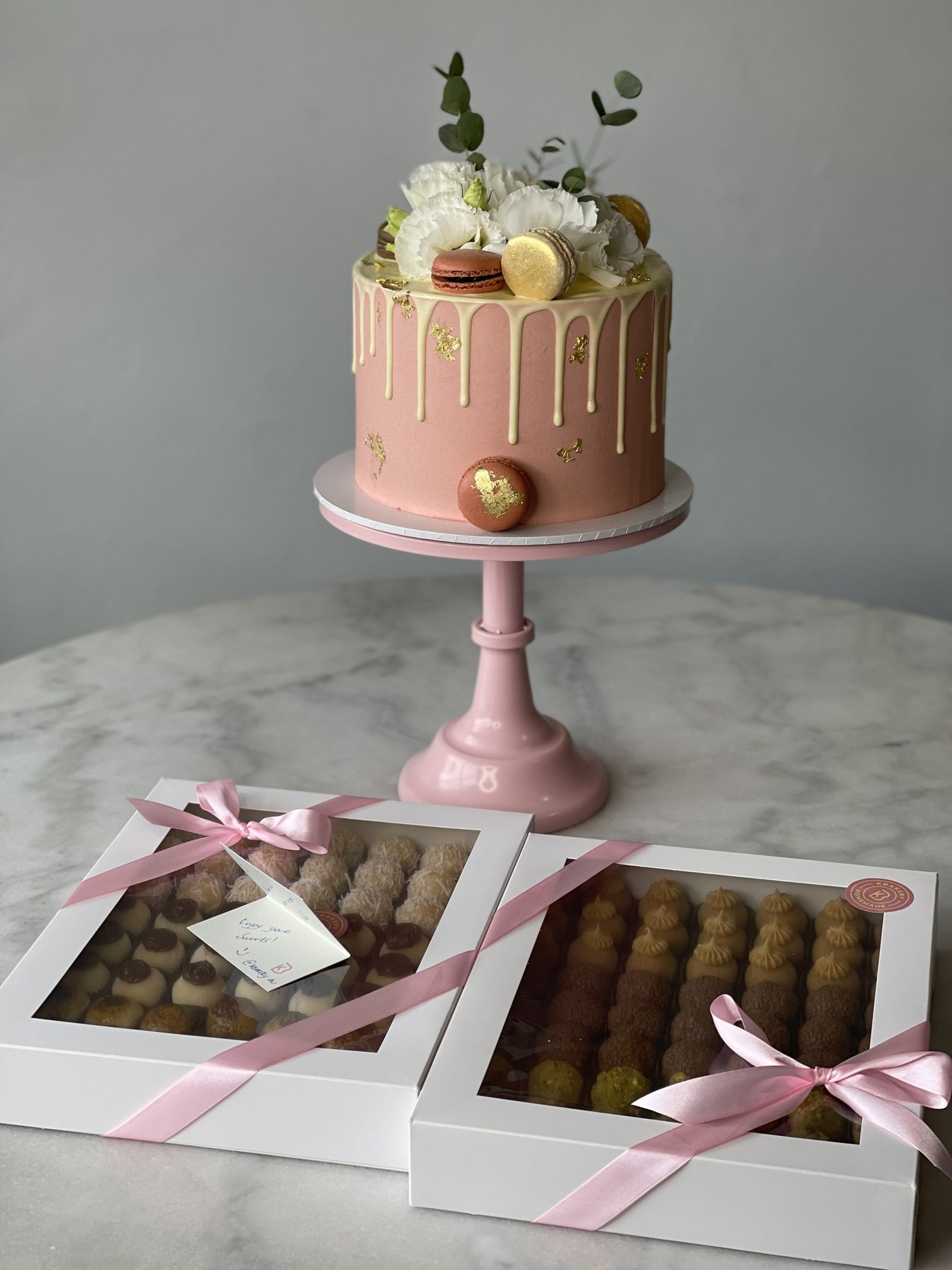 Picture-perfect pink cake with a decadent white chocolate drip on top. Adorned with fresh flowers and a sprinkle of golden macarons, this beauty is sure to steal the show at any celebration. Indulge in sweetness with a touch of glam.