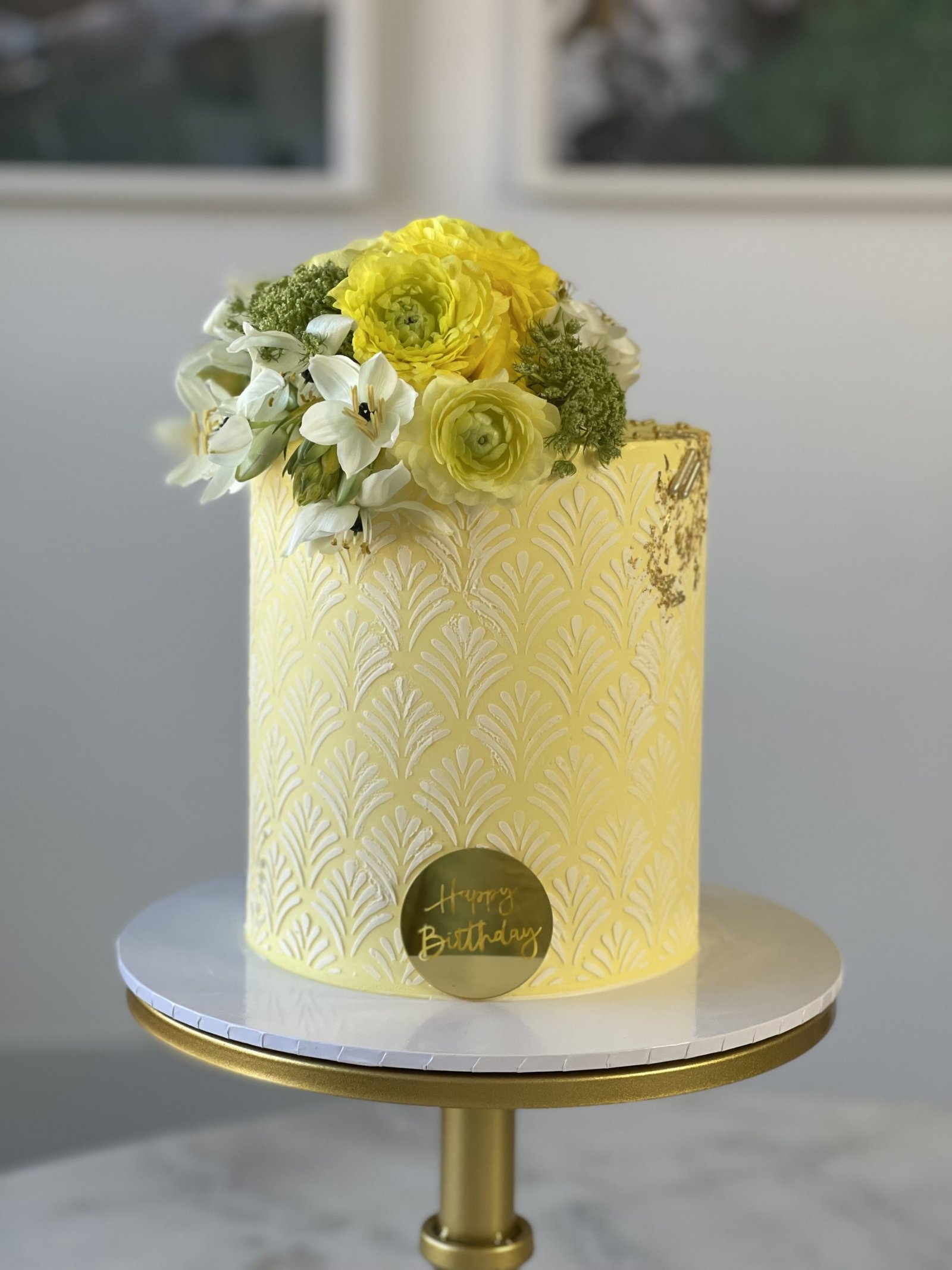 Embrace the beauty of Yellow blooms with our Bloom Birthday Cake. Featuring a charming yellow base adorned with elegant white accents and touches of shimmering gold. Topped with fresh flowers for a touch of natural splendor and finished with a radiant golden ‘Happy Birthday’ plaque, this cake is a true celebration of elegance and joy.
